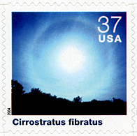Stamp of cirrostratus fibratus cloud in a series of weather cloud stamps has full 22° halo.
