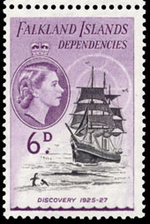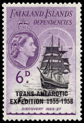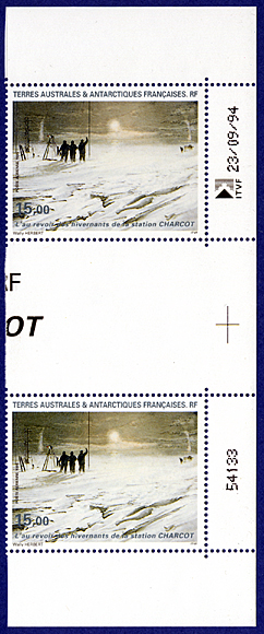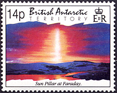 A sun pillar above Faraday station. This is part of four stamps series with two halo stamps. Other two stamps have clouds.