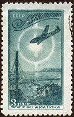 Stamp for E.T. Krenkel, a Soviet Artic explorer and a Hero of the Soviet Union. There is in a up left corner a sun or moon with a halo like ring almost all the way around it. That is so halo like feature that it probably is based on