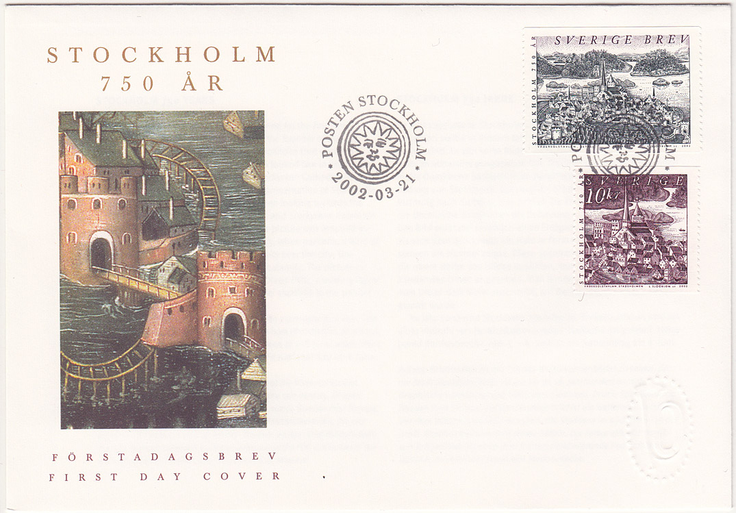 A stamp showing a part of famous painting called "Vädersolstavlan" from Stocholm Storkyrkan (Stockholm catherdal). Vädersolstavlan has an all-sky halo display observed 20 April 1535. This stamps shows only a small portion of parhelic circle behind the SVERIGE text.