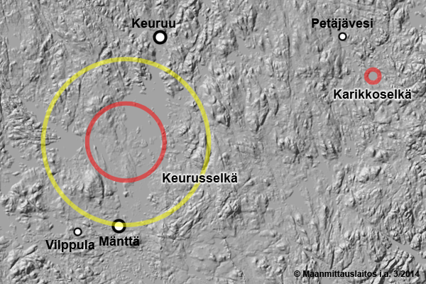 KraatteriKartoituksessa selvisi että Keurusselkä on vanhan ja kuluneen törmäyskraatterin jäänne. Keurusselkä on siitä erikoinen ettei kraatterikuoppaa enää ole. Kraatteri on satojen vuosimiljoonien kuluessa kulunut kokonaan pois ja jäljellä on alkuperäisen kraatterin pohjan alapuolinen rikkoutunut ja pirstekartioitunut kallioperä. Jäljellä on pelkät "juuret" kraatterista. Tämän vuoksi voisi mieluummin puhua törmäyskraatterin jäänteistä eli törmäysjäljestä kuin törmäyskraatterista. Tutkimusten mukaan selvien pirstekartioiden syntymiseen vaadittu 2 GPa painealue ulottuu törmäyskohdasta noin puolen kraatterin säteen verran ulospäin. Pirstekartioiden runsaampi esiintyminen ja hyvälaatuiset pirstekartiot rajoittuvat Keurusselällä 7 km läpimittaisen alueen sisälle. Pirstekartioita tai niitä muistuttavia kaarevia rakenteiden löytyy lähes 14 km läpimittaiselta alueelta. Tämän ulkopuolelta tarkistetuista kalliopaljastumista ei ole löydetty edes mahdollisia pirstekartioita. Tämän päättely johdosta olen käyttänyt Keurusselän kokona tuota 14 km. Kallioperän rakoilua voi tavata kauempanakin, mutta sen erottaminen muusta rakoilusta vaatisi työläitä tutkimuksia eikä tulkinta ole helppoa. Valkeaniemen ympärillä oleva 7 km läpimittainen alue on todennäköisesti alkuperäisen kraatterin keskuskohouman alue. Alueelta raportoitiin vuonna 2010 shokkilamelleja in situ pirstekartiokivissä (Ferriére 2010). In situ shokkilamellit vahvistavat keskuskohouman sijaitsevan nimenomaan Valkeaniemen alueella. Todellisuudessa kraatterin pohja on eroosion vuoksi kulunut kokonaan pois, joten todellinen alkuperäinen kraatteri ollut vieläkin laajempi. Yllä olevaan karttaan olen merkinnyt topografiasta löytyvä 22 km läpimittaisen alueen keltaisella renkaalla. Keltainen rengas voi olla lähempänä kraatterin todellista alkuperäistä kokoa.