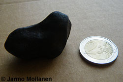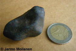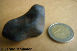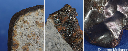 Kuvapari jollaisia toivoisi meteoriittiehdokkaista lähetettävän. Tosin kuvasta puuttuu mittakaava, mutta kappaleen koon voi myös kertoa jolloin mittakaavan puute ei ole ongelma. Vasemmalla on lähikuva yksityiskohdista (kuvattu makro-objektiivilla) jossa näkyy sekä mahdollinen sulamiskuori ja kiven sisusta. Oikealla yleiskuva joka näyttää koko kappaleen. Kuvista voi nähdä jokseenkin selvästi että musta pinta on kuorena valkean sisustan ympärillä ja että kuori on haljennut sulan kiviaineksen jäähtyessä ja kutistuessa. Kuvista näkee myös että vaaleassa sisustassa on joitain täpliä (ruostetta keränneitä metallihitusia) ja mustia juonia (shokkijuonia). Kiven kulmat ovat myös selvästi pyöristyneet kitkan aiheuttaman kuumuuden johdosta. Tämä kuvapari saisi jo asiantuntijankin pulssin kiihtymään.